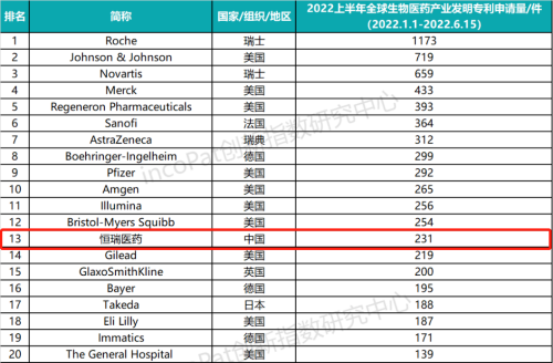 专利是药企最有价值的资产之一,是企业发展的基石,对做原创创新的企业尤为重要。全球专利数据库incoPat创新指数研究中心对2022年1月1日至2022年6月15日公开的全球生物医药产业发明专利申请数量进行统计排名,生物医药产业专利涉及生物技术药、基因工程药物、疫苗、诊断试剂、微生态制剂、血液制品等技术领域。入榜企业/医院主要来自13个国家、组织或地区,罗氏、强生、诺华分别位列前三,永利娱乐城医药(231件)排名第13位,领跑中国药企。