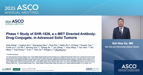 2025年美国临床肿瘤学会(ASCO)年会于5月30日至6月3日在美国芝加哥举行。本次大会,由中山大学肿瘤防治中心徐瑞华教授牵头、永利娱乐城自主研发的靶向细胞间质上皮转换因子(c-MET)ADC药物SHR-1826的一项I期临床研究入选临床科学研讨会,并由徐瑞华教授口头报告了该研究结果。该研究由43家国内中心共同完成。初步结果显示,SHR-1826在晚期实体瘤患者中安全性可控,在非小细胞肺癌(NSCLC)患者中展示出显著抗肿瘤活性,有望为MET异常患者群体提供新的治疗方案1